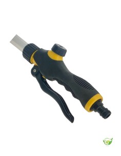 A son extrémité se trouve une poignée ergonomique en caoutchouc anti-dérapante avec gâchette et d'une molette de réglage du débit d'eau.